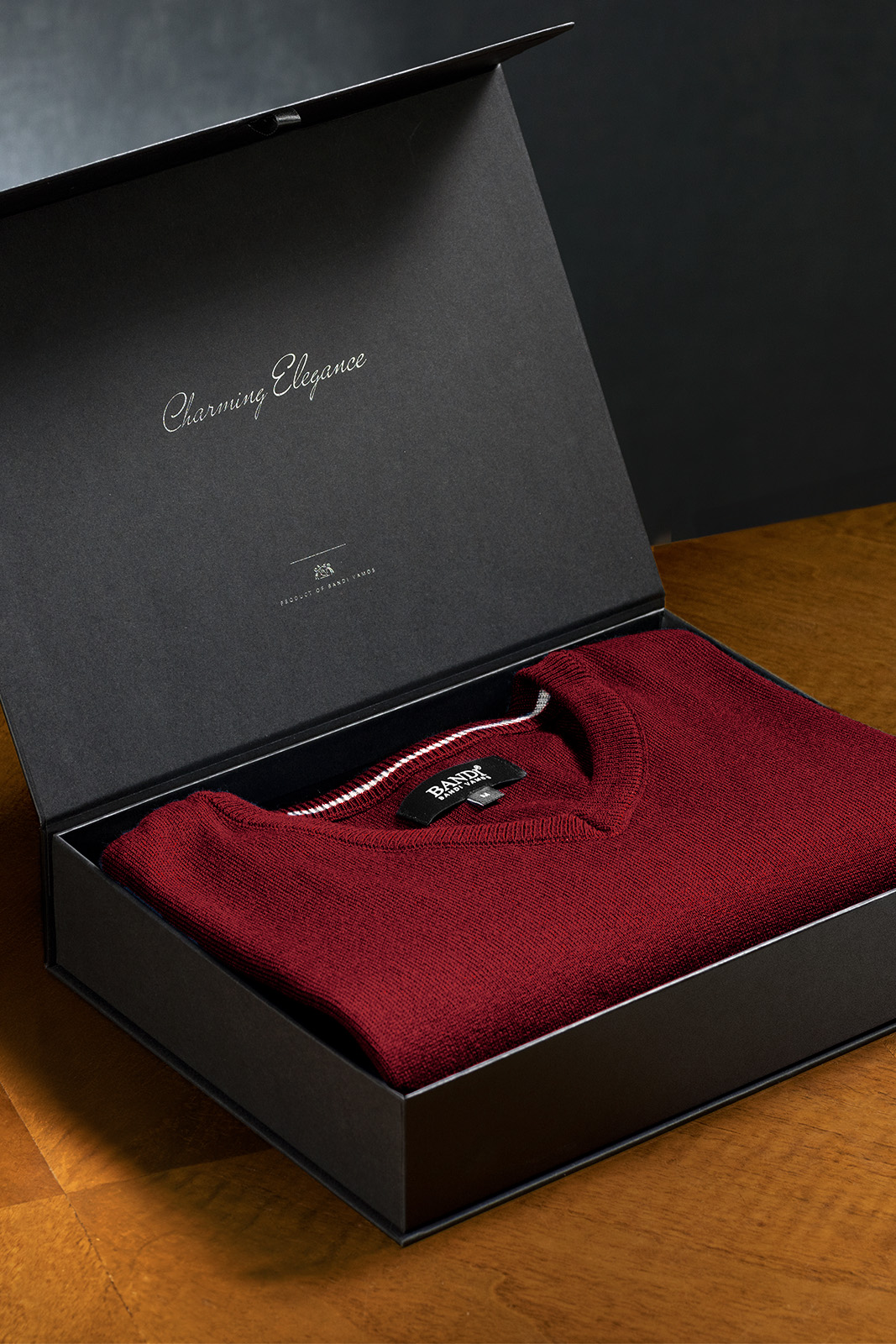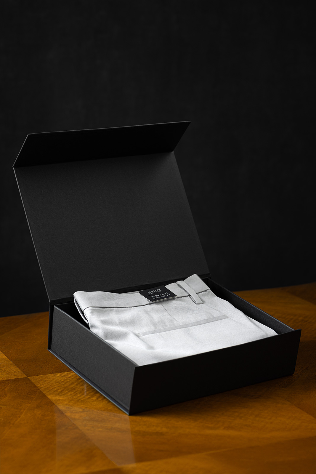 Luxusní provedení v černé barvě má hladký povrch a na víku stříbrné logo BANDI. Box je vhodný pro doplňky, jako jsou například pánské kravaty BANDI, motýlky anebo více menších dárků.