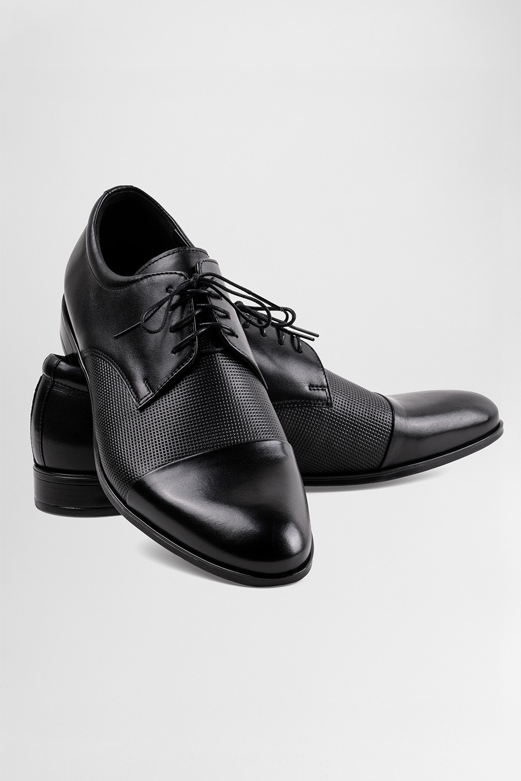 Černá kožená obuv CASTELLO má ozdobnou strukturu a kulatou špičku. Šněrování je řešeno typem derby, díky němuž jsou boty vhodné pro jakékoli chodidlo a snadno se obouvají. Stélka má navíc výplň z Aloe vera, která zajišťuje pohodlí při nošení. Matný design činí model univerzálním, obout jej můžete do zaměstnání ale také na společenské události.