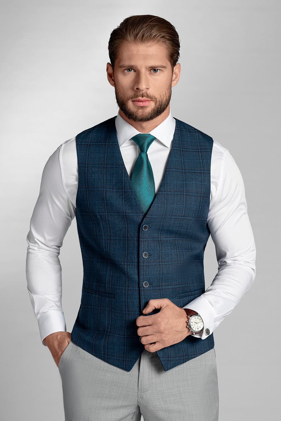 Díky barevné škále modrých a šedých odstínů vestu vynosíte s jakýmkoli světlým i tmavým oblekem. Originální károvaný vzor vnese do vašeho šatníku nádech uvolněné elegance.