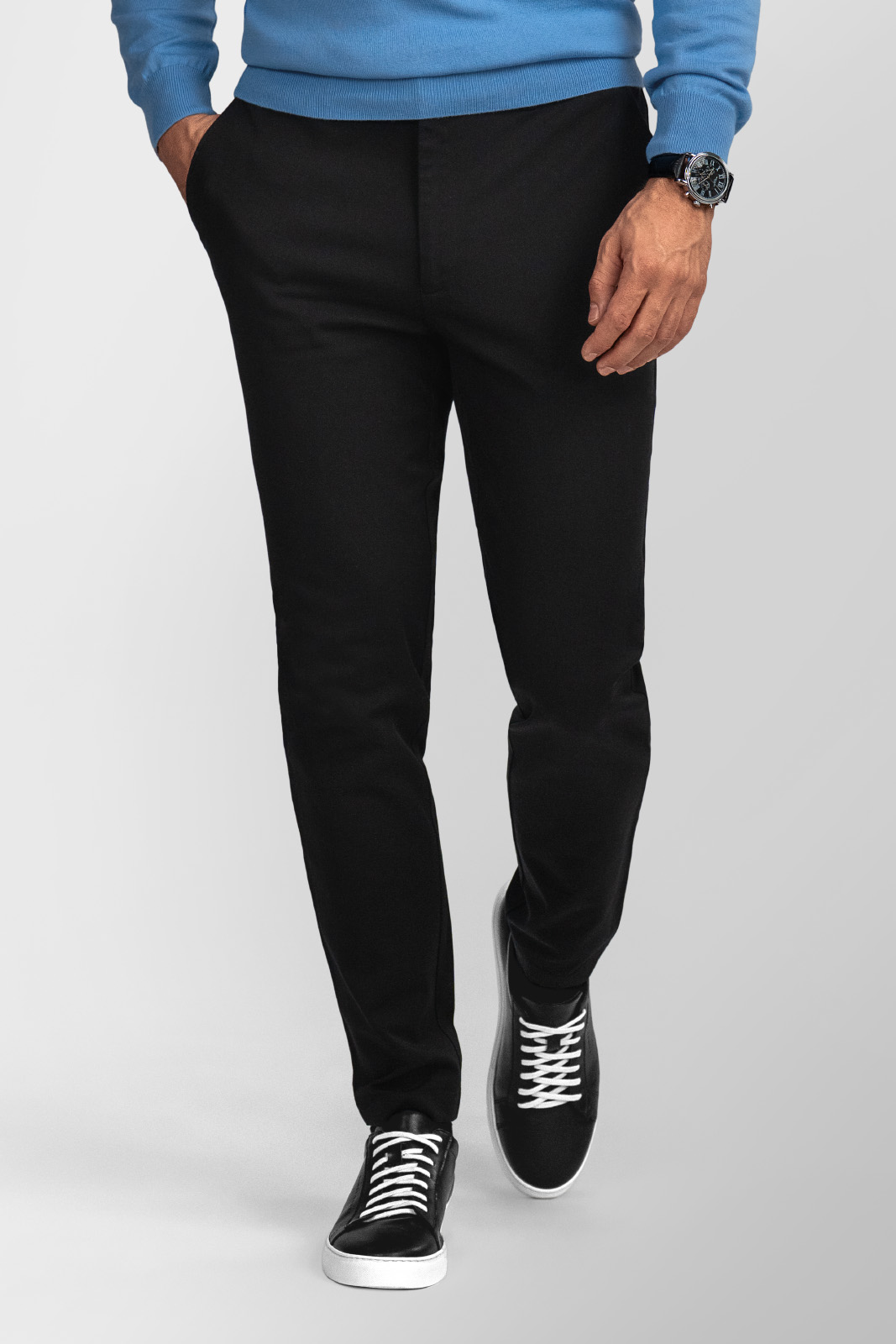 Kombinace bavlny, modalu a elastanu zajišťuje dokonalou prodyšnost, měkkost a příjemnou pružnost, díky čemuž vám kalhoty poskytnou maximální komfort během celého dne. Černé chinos nabízejí univerzální elegantní vzhled, který snadno zkombinujete s formálními i volnočasovými kousky.