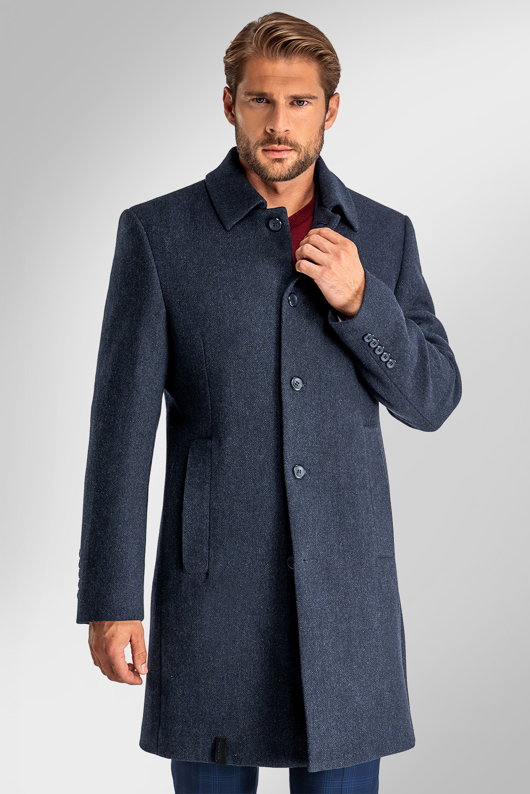 Podrobný popisPánský kabát POSCARI v tmavě modré barvě je navržen bez klopy se zapínáním na knoflíky až ke krku. Tento střih vytváří elegantní siluetu a zároveň poskytuje vyšší tepelný komfort. Decentní vzor rybí kosti dodává materiálu jemnou strukturu a podtrhuje módní vzhled kabátu.