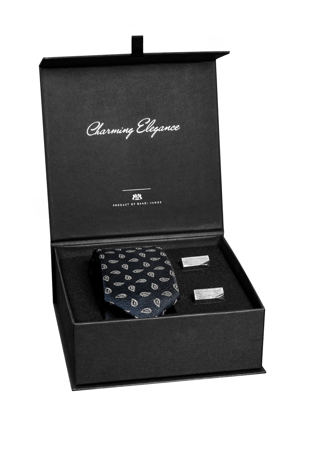 Sada hedvábné kravaty s manžetovými knoflíčky stříbrné barvy je ideálním dárkem pro každého muže. Vázanku v nadčasové tmavě modré barvě s kašmírským vzorem obléknete do práce i na slavnostní události, stejně jako minimalistické manžetové knoflíčky. Díky studenému odstínu se tyto dva kousky perfektně doplňují a dodají mírný lesk nejednomu outfitu.