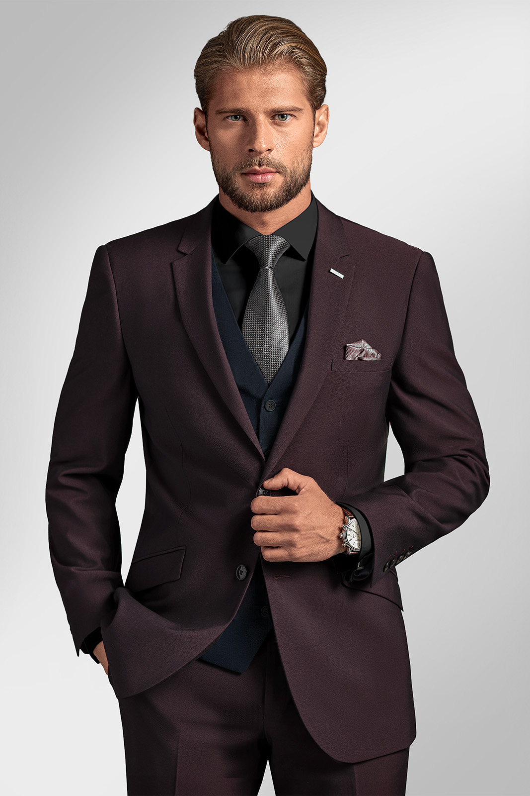 Minimalistický design obleku nechá vyniknout neokázalý bordó odstín látky, který ladí s mnoha různými odstíny košil, svetrů, kravat a dalších doplňků. Poskytne vám tak nekonečný prostor k experimentování a vytváření jedinečných kombinací ve vašem osobitém stylu.