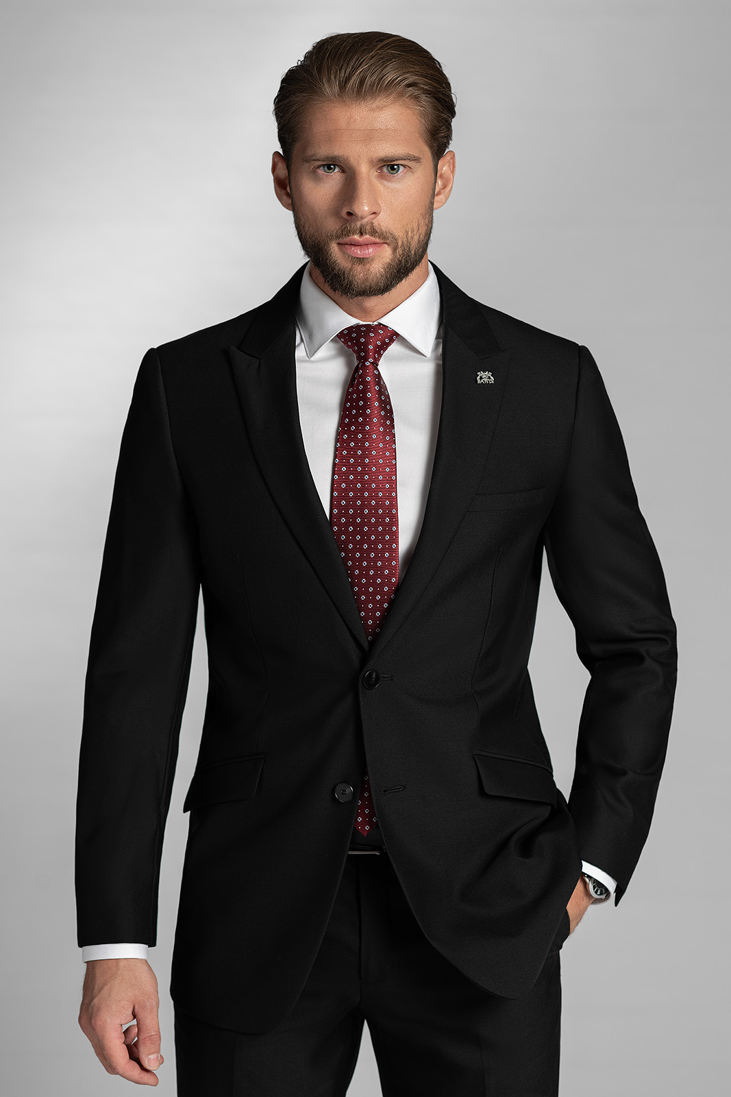 Moderní, minimalistický design a špičatá „peaková“ klopa spolu s klasickým střihem a černou barvou luxusní látky povyšuje charakter obleku na vyšší formální úroveň. Díky těmto prvkům se z obleku stává dokonalý základ slavnostního outfitu na všechny společenské a oslavné události.