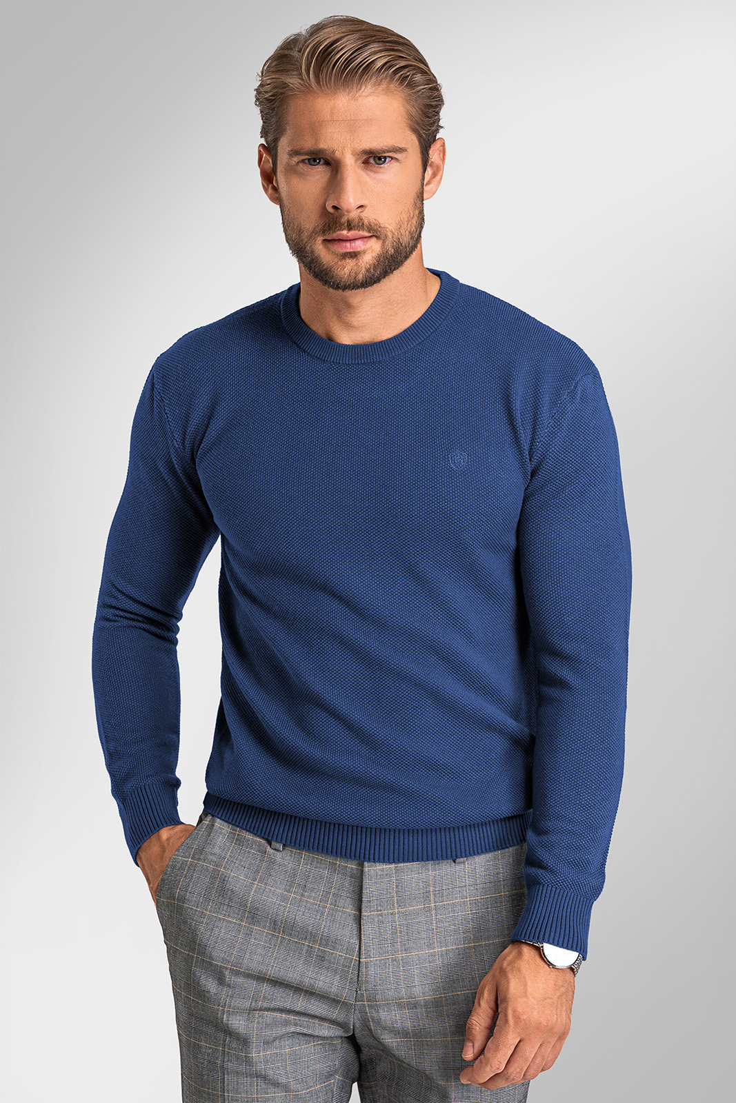 Hledáte výrazný svetr, který dodá vašemu outfitu osobitost a zároveň si zachová elegantní vzhled? Model EDGARO v modrém odstínu zaujme jemnou strukturou, která dodává svetru svěží sportovní nádech při zachování formálního kultivovaného stylu. Je ideální volbou pro každodenní nošení.