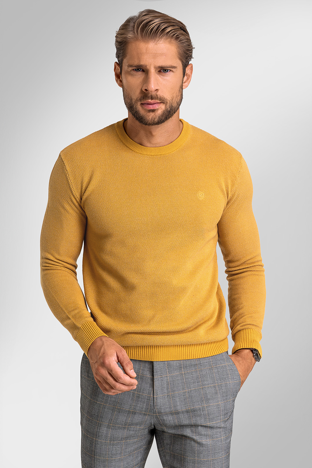 Hledáte výrazný svetr, který dodá vašemu outfitu osobitost a zároveň si zachová elegantní vzhled? Model EDGARO v tmavě žlutém okrovém odstínu zaujme jemnou strukturou, která dodává svetru svěží sportovní nádech při zachování formálního kultivovaného stylu. Je ideální volbou do zaměstnání i pro volný čas.